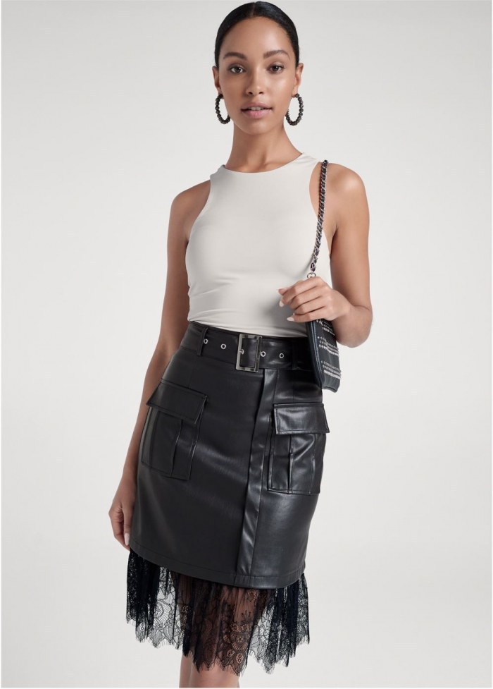 • Venus Black BELTED LACE FAUX LEATHER SKIRT