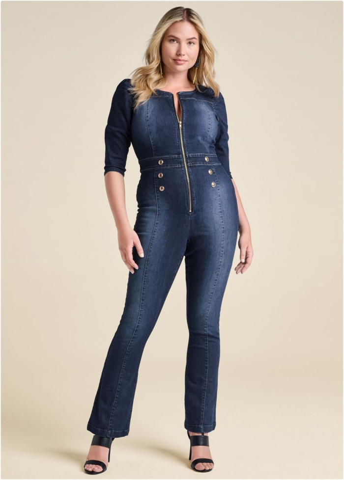 • Venus Plus Size Denim Zip Jumpsuit in Dark Wash