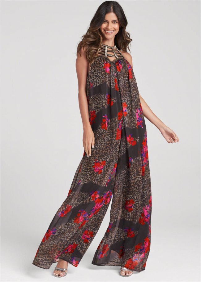 Venus Mock-Neck Leopard Romper in Brown Multi